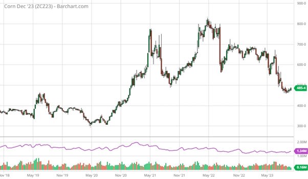 Corn (USD/BU), five-year weekly chart