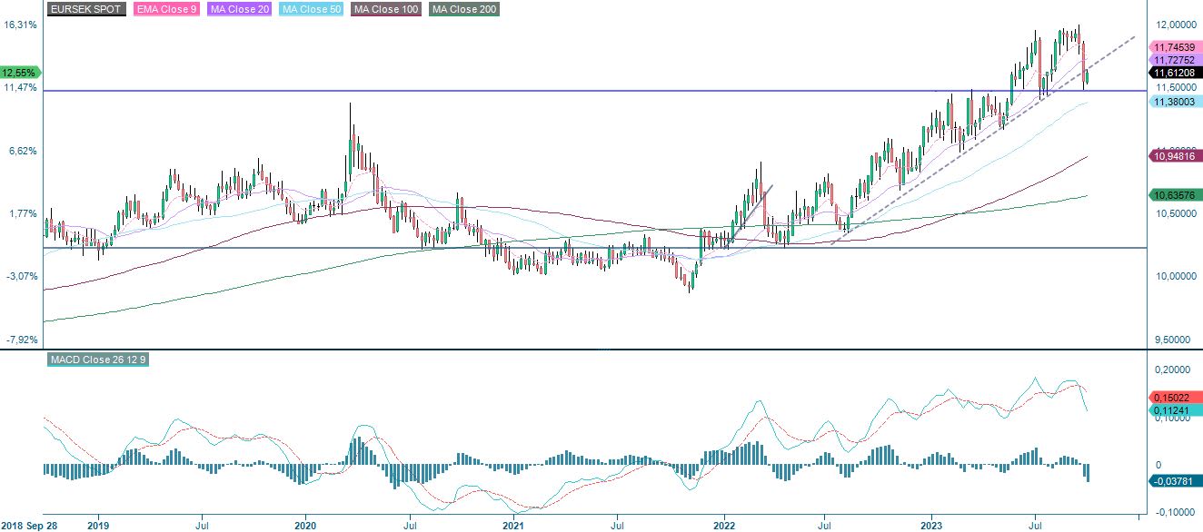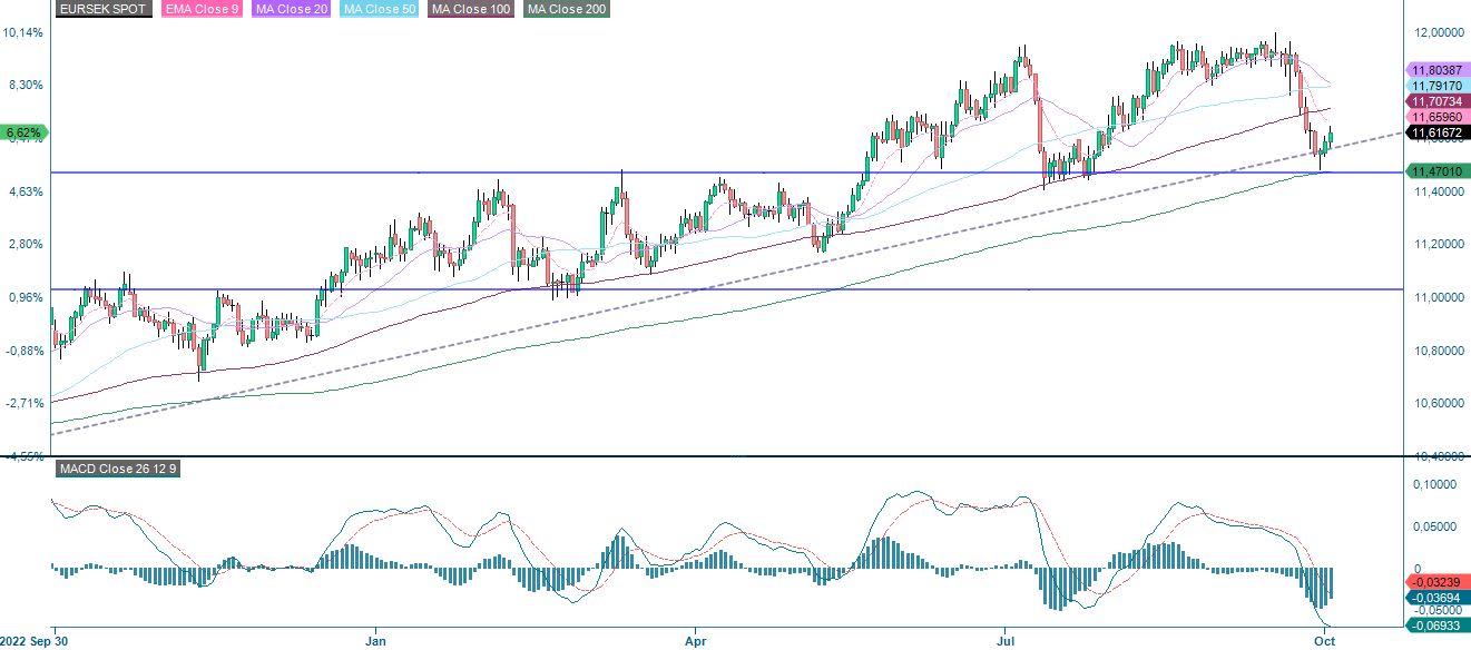 Swedish Riksbanken was trying to strengthen the SEK by selling its foreign currency reserves. This did indeed strengthen the SEK, as shown in the chart below. Were the interventions enough to continue to strengthen the SEK? If so, the strong support at 11.5 is the first to be broken on the downside, followed by levels just north of 11.0.