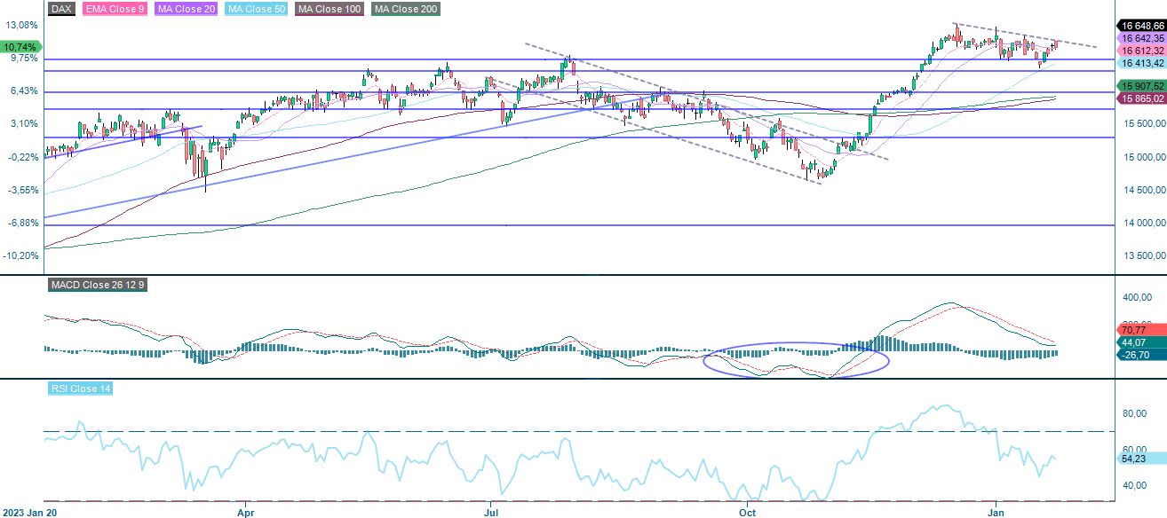 Den tyske DAX har også taget et pænt spring op fra MA50. Loftet på den smalle faldende trendlinje er den første modstand på opsiden.