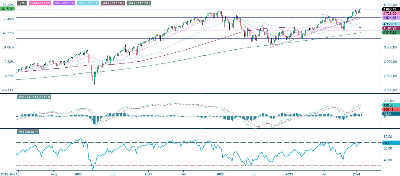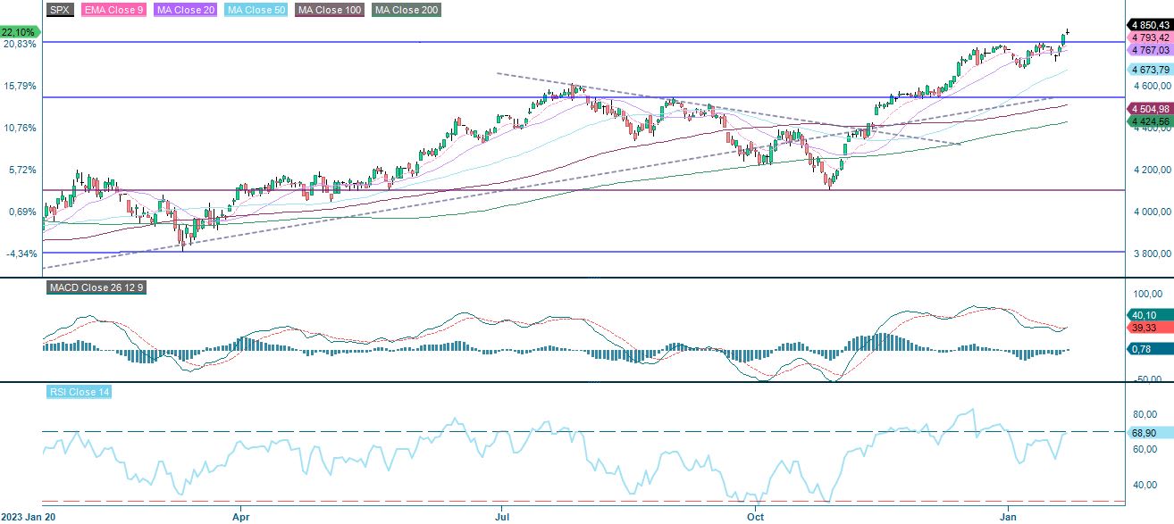 Fredag den 19. januar 2024 havde omkring 50 S&P500-selskaber rapporteret deres resultater for fjerde kvartal. 62 % af S&P-selskaberne har rapporteret en positiv EPS-overraskelse, og 62 % har rapporteret en positiv omsætningsoverraskelse.