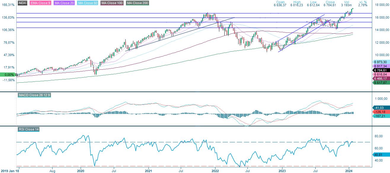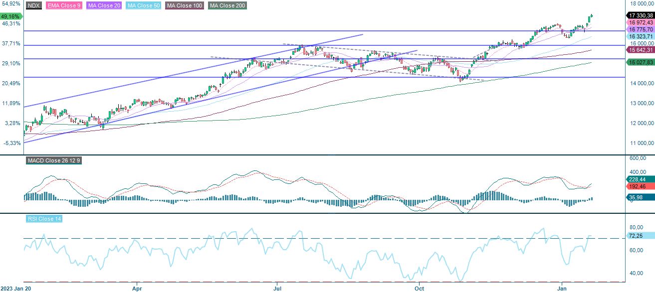 Som det fremgår af diagrammet nedenfor, befinder Nasdaq 100 sig allerede på et overkøbt niveau med hensyn til RSI.