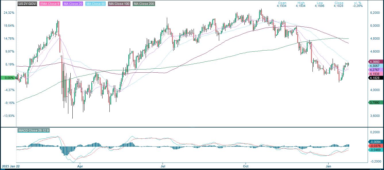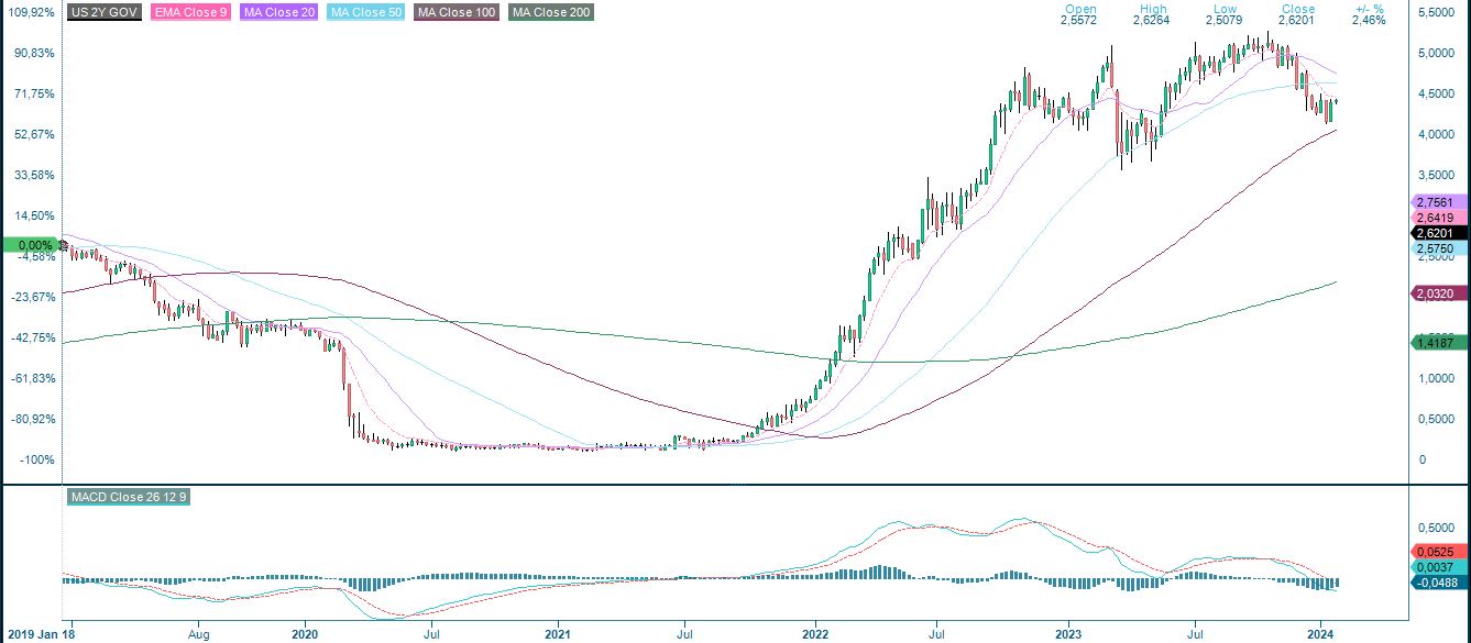 Den amerikanske PCE-inflation lå på omkring 1,5 % indtil marts 2021, hvor den begyndte at stige hurtigt og toppede på 6,8 % i juli 2022. I marts 2023 lå PCE på omkring 5 %, og i maj 2023 lå den lige over 4 %, hvorefter den faldt til 2,6 % i december 2023. Den amerikanske toårige statsrente er steget fra et lavpunkt på 4,09 % den 12. januar til 4,37 % i skrivende stund, hvilket indikerer usikkerhed om det fremtidige inflationstempo i USA.