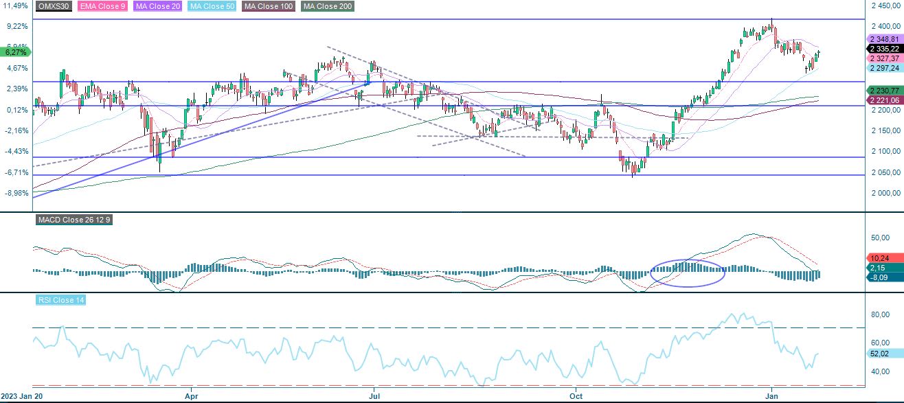 Svenske OMXS30 er måske lidt mere interessant set ud fra en ny lang position. Som det fremgår af grafen nedenfor, har indekset taget et pænt spring op fra MA50. Et brud over MA20, som i øjeblikket ligger på 2.348, og den tidligere top omkring 2.400 kan være det næste. For at reducere risikoen kan et spread, som er langt i OMXS30 og kort i S&P 500, være et alternativ.
