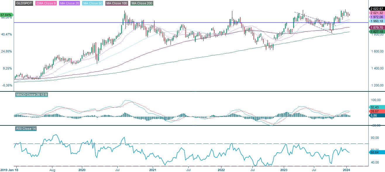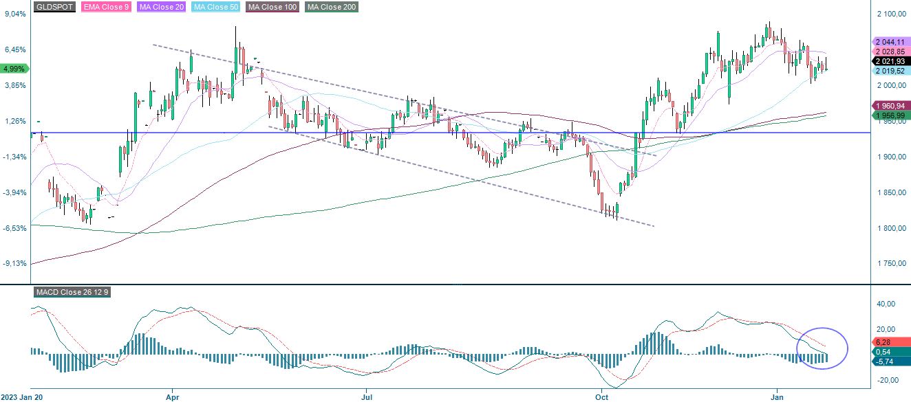 Guldet steg kraftigt i løbet af den amerikanske morgensession fredag den 19. januar og nærmede sig den runde 2040-dollarmarkering. Den primære årsag til dette var, at spændingerne i Mellemøsten forblev høje, hvilket førte til øget efterspørgsel efter guld som en sikker havn i weekenden. Det svagere USD-indeks var en anden ekstern faktor, der støttede markedet for ædelmetaller. Vi er ganske positive i forhold til guld ud fra en fundamental synsvinkel. Vi ville dog være mere skeptiske (ud fra en teknisk synsvinkel), hvis guldet skulle falde til under 2.000 USD pr. troy ounce.