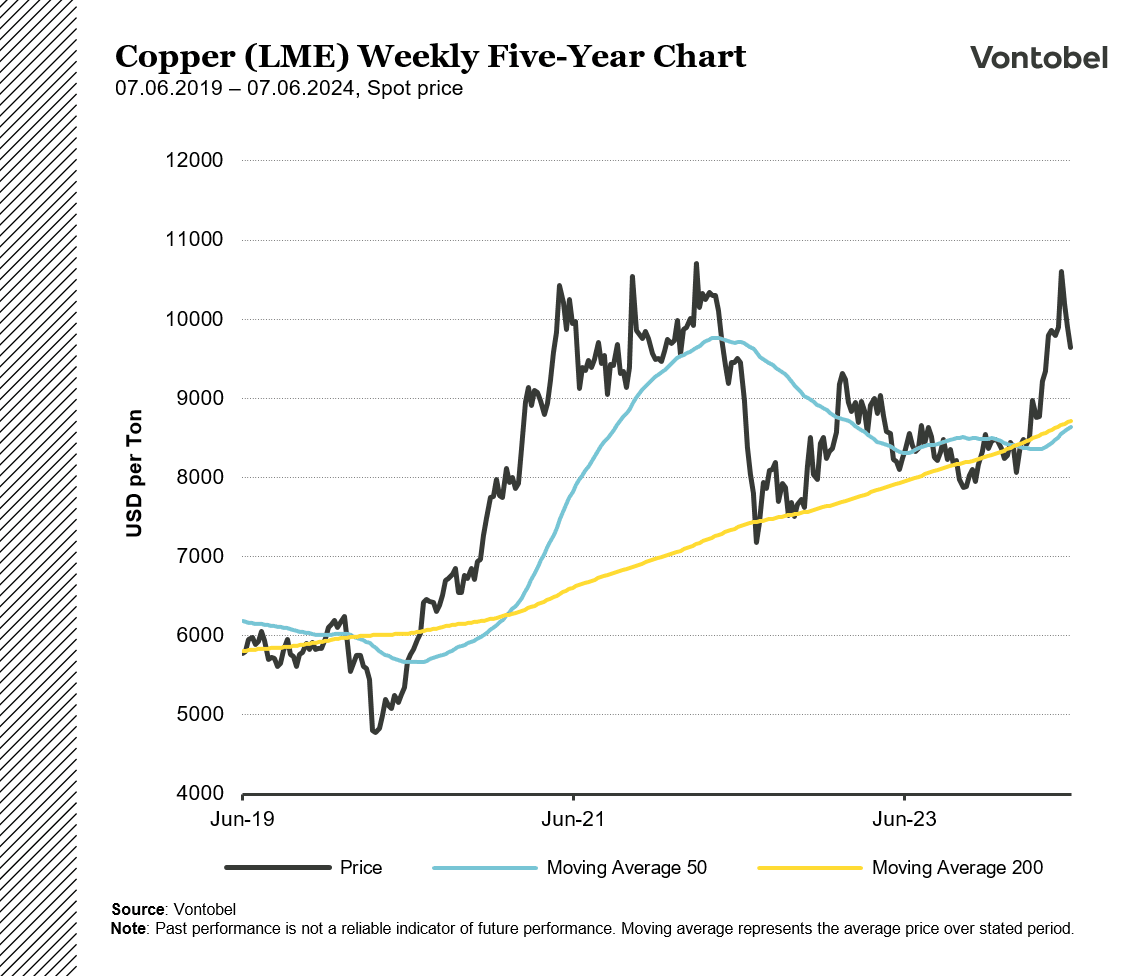 Kobberprisen er faldet tilbage under 10.000 USD/ton, siden vi senest så nærmere på metallet. Kobber er dog stadig tæt på sit højeste niveau i fem år og over de glidende gennemsnit 50 og 200.