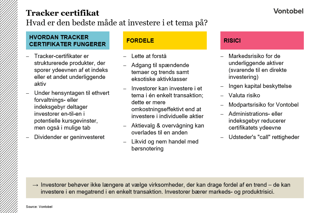 Mange tendenser driver de globale kapitalmarkeder på grund af deres stærke dynamik. Tematiske investeringer kan i denne sammenhæng skabe merværdi i en investeringsportefølje. Tracker-certifikater repræsenterer et effektivt middel til at spore disse temaer. Med "tematiske certifikater" kan investorer investere i veldiversificerede instrumenter, der er i stand til at spore tendenser i kun én transaktion.