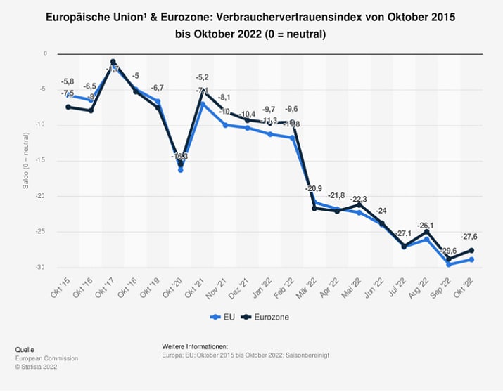 Der Verbrauchervertrauensindex (Consumer Confidence Indicator - CCI) erreicht in der Europäischen Union (EU-27) im Oktober 2022 mit rund -28,9 Indexpunkten den zweitniedrigsten Wert seit Beginn der Datenerhebung. Der Indikator bildet den Durchschnitt der Salden aus Fragen zur finanziellen Situation der Haushalte, der allgemeinen wirtschaftlichen Lage, erwartete Entwicklung der Arbeitslosigkeit als auch zum Sparverhalten ab und bezieht sich auf die nächsten 12 Monate. Die stark negativen Werte seit 2022 zeigen, dass die Situation pessimistisch bewertet wird.