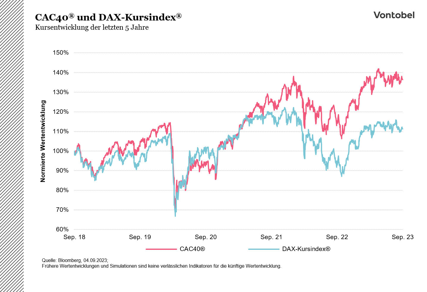 Angesichts des stärkeren Wachstums der französischen Wirtschaft stellt sich die Frage, ob der Aktienmarkt eine vergleichbare Performance vorweisen kann. Um diese zu beantworten, lohnt sich ein Blick auf den französischen Leitindex CAC40®: Dieser beinhaltet die 40 führenden Aktiengesellschaften, die an der Börse in Paris notiert sind. Die Performance des Index über die vergangenen zwölf Monate Jahresanfang liegt bei ca. plus 21 Prozent. Dies mag im Vergleich zum DAX® auf den ersten Blick schlechter erscheinen, da der deutsche Leitindex im selben Zeitraum ein Plus von über 25 Prozent vorweisen kann. Dabei ist jedoch zu beachten, dass es sich im Fall des CAC um einen Kursindex handelt, welcher keine Rücksicht auf Dividendenausschüttungen nimmt. Somit kann man den Index nicht direkt mit dem DAX®, welcher ein Performance-Index ist, vergleichen. Der DAX-Kursindex® kommt über die letzten zwölf Monate ebenfalls auf ein Plus von rund 21 Prozent, was verdeutlicht, dass der französische Leitindex ähnlich gut abschneidet. Auf längere Sicht stellt der CAC40® den DAX-Kursindex® jedoch in den Schatten. So stieg der französische Leitindex in den letzten fünf Jahren um ca. 36 Prozent, während der DAX-Kursindex® nur um 11 Prozent zulegte, wobei beide eine historische annualisierte Volatilität von ca. 21 Prozent aufweisen. Dabei ist jedoch zu beachten, dass es in schlechten Marktphasen auch zu deutlichen Rücksetzern kommen kann. So fielen beide Indizes um satte 39 Prozent zu Beginn der Corona-Pandemie.