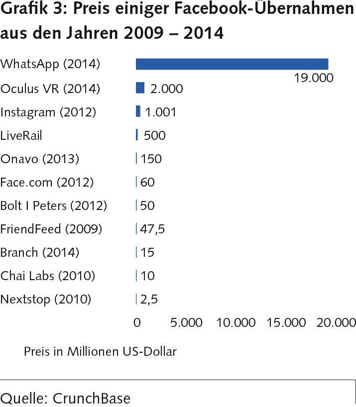 Man muss allerdings nicht immer bei null anfangen, um innovativ und erfolgreich zu sein. Große Internet-Giganten wie Facebook und Google machen es vor: Sie verfügen meist über riesige Cash-Reserven und nutzen gute Gelegenheiten, um ganz einfach »auf Einkaufstour zu gehen«. Denn immer neue Start-ups schießen wie Pilze aus dem Boden – sofern man das »nötige Kleingeld« hat, reicht es zuzugreifen. Es handelt sich um eine effektive Methode der großen Etablierten, um entweder neue und zukunftsträchtige Geschäftsfelder zu erschließen oder potenziell starke Newcomer von vornherein auszumerzen. Facebook kaufte im Februar 2014 den Messenger-Dienst WhatsApp für stolze USD 19 Milliarden. Grafik 3 zeigt den Preis von weiteren Facebook-Übernahmen seit 2009.