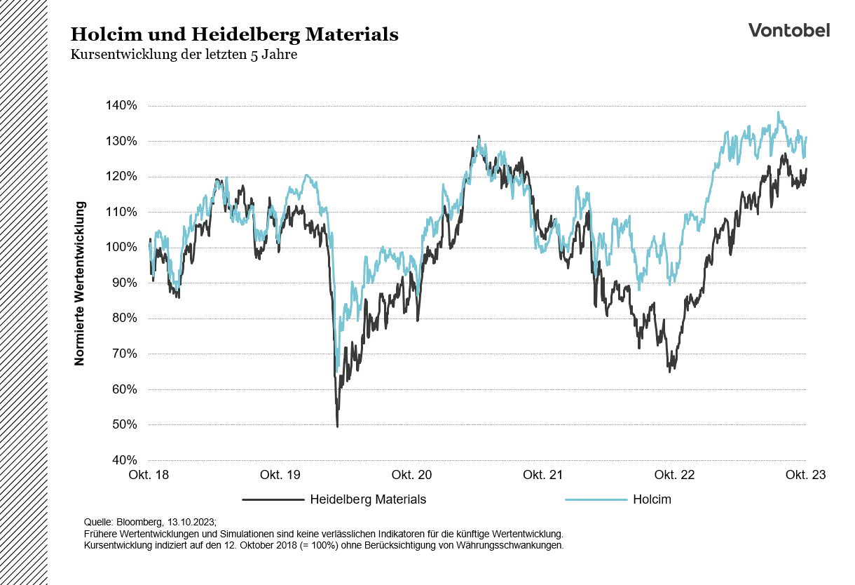 Heidelberg Materials, ehemals HeidelbergCement, gehört neben Holcim zu den größten Baustoffunternehmen der Welt. Dabei sind sie in Deutschland Marktführer in den Bereichen Zement, Transportbeton und führend bei Sand und Kies. Im ersten Halbjahr des Jahres 2023 konnte Heidelberg Materials trotz eines schwächeren Marktumfeldes den Umsatz und Gewinn steigern und das Jahresziel anheben. Vergleicht man die Kursentwicklung der beiden Giganten miteinander, hat Holcim allerdings auf 5-jahres-Sicht die bessere Performance hinlegen können.