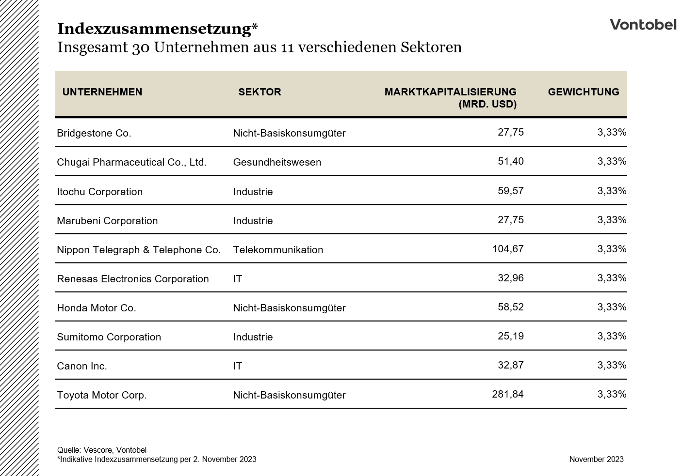 Der Vontobel Japan Equity Strategy Index vereint somit am Ende dieses Auswahlprozesses diejenigen japanischen Unternehmen, die vor dem Hintergrund einer attraktiven Bewertung vom veränderten wirtschafts- und geldpolitischen Rahmenbedingungen in Japan profitieren könnten. Auf diese Weise können Wachstumschancen gezielt ausgenutzt werden. Ob sich der bestehende Aufwind für den japanische Aktienmarkt weiter fortsetzt, ist noch nicht absehbar. Nachfolgend dargestellt wird eine Übersicht von zehn beispielhaften Unternehmen aus der Indexzusammensetzung. Die fünf Handelsunternehmen, die von Value-Investoren-Legende Warren Buffett präferiert werden, sind ebenfalls im Index enthalten.