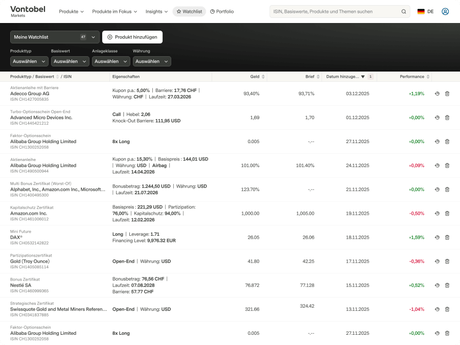 Haben Sie bereits ein Benutzerkonto?AnmeldenoderBenutzerkonto erstellenTitleHerrFrauVornameNachnameE-Mail AdressePasswortIch habe die Bedingungen gelesen und akzeptiere dieAllgemeine GeschäftsbedingungenMarkets Benutzerkonto erstellenErstellen und verwalten Sie Ihre Watchlist1 / 0