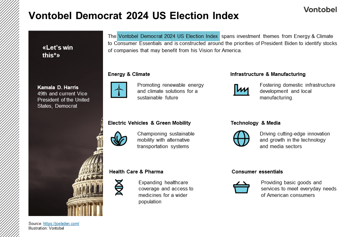 As the US election draws nearer, so does the anticipation of how markets might perform in the aftermath. The candidates and their policy positions are now known. Our two US strategy indices allow investors to participate in the performance of sectors that could benefit from the election. Discover the Vontobel Democrat 2024 US Election Index here.