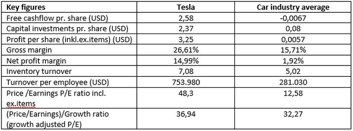 Tesla undoubtedly operates very differently to the traditional players in the industry. The disadvantage of doing everything new is that there will always be some trial and error before you get it right, but the advantage is that you don't have to resort to an organization, factories and supply chain that are better adapted to history than to the future. This is also visible if you look at a number of fundamental key figures compared to the industry average. The figures are for the last year (trailing twelve months).