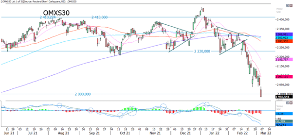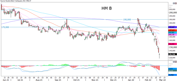 A company in a completely different industry but with similar exposure to Russia is H&M, with around 3% of group revenues coming from the country. In total, H&M has about 170 stores in Russia. The company has decided to pause its sales in Russia temporarily. H&M's share price has fallen in much the same way as Volvo (16% in the last week and 18% in a month). On Friday, there was a Doji, implying uncertainty of the next move.