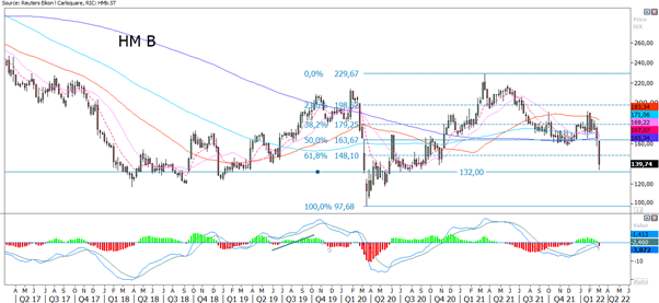 In the weekly chart, one can see how the H.M.stock is approaching support around SEK 132:
