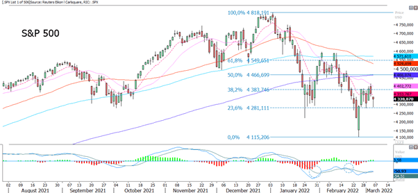 S&P 500 index graph (in USD) August 5, 2021, to March 4, 2022