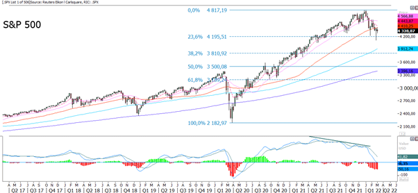 The U.S. stock market has managed better. Nevertheless, the previous week ended down. The daily chart below shows that the broad S&P 500 is still under pressure by a falling EMA9 and MA20. Fibonacci 23.6 is the first level of support on the downside.