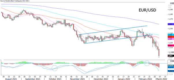 The U.S. Labor Bureau released better-than-expected employment data for February on Friday, March 4 (678,000 new jobs against the Consensus forecast of 423,000 new jobs). At the same time, the January 2021 jobs number was revised up to 481,000 new jobs from 467,000 previously. The USD strengthened against the EUR. The EUR, in its turn, dived due to the Russian sanctions before these U.S. employment numbers were released.