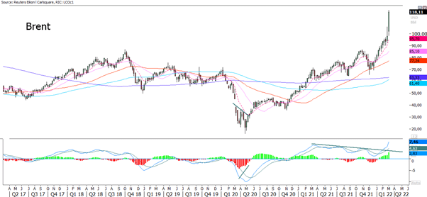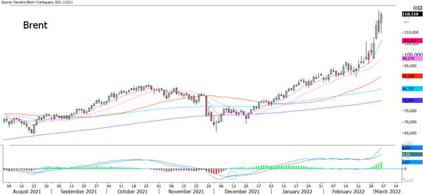 Russia's primary export goods are petroleum, natural gas, metals, wood and wood products, chemicals, and military manufacture. The sky seems still to be the limit also for the Brent oil price. There have been no energy sanctions so far on Russia. If it materializes, it is likely to continue to drive energy prices, such as oil. Equities are likely to be hurt by such a scenario, as input prices are likely to increase, and to that, you could add further inflation.