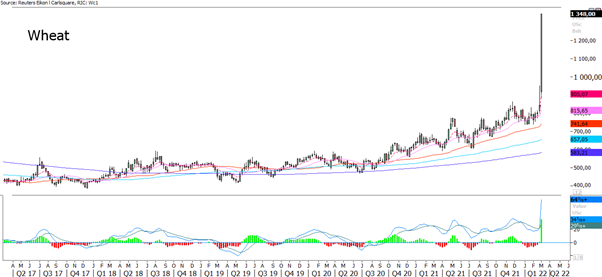 The spike in the wheat price illustrates the Ukraine war's effects on commodities. Russia and Ukraine are both top-ten global exporters of wheat.