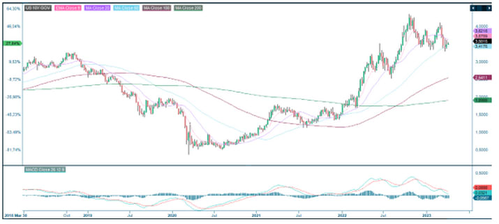 US equity markets ended the first quarter on Friday, 31 March, with broad-based gains for the S&P 500, Nasdaq and Dow Jones. Friday's personal consumption expenditures (PCE) inflation in the US came in slightly lower than expected, at 4.6% compared to 4.7%. That contributed to a fall in interest rates and increased risk appetite in the market. The two-year US Treasury yield fell by around 15 basis points to a low of 4.02% on Friday evening. Speculation that the Fed might pause its rate hikes has gained new momentum, with the futures market pricing at 50% for an unchanged policy rate in May.