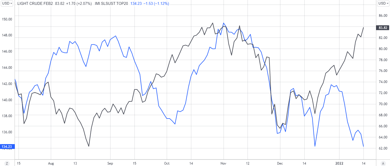 Vontobel has issued an open-end tracker on MSCI World IMI Select Sustainable Impact Top 20 Index. This index has also spread apart from the oil price: