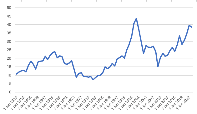 Schiller P/E-ratio from January 1, 1950, to January 14, 2022