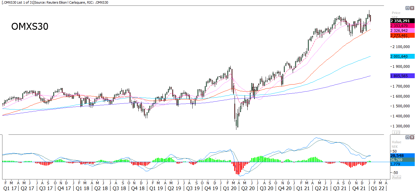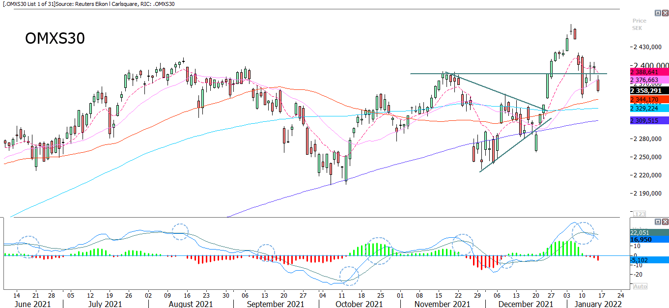 Swedish OMXS30 closed Friday below EMA9 and MA20. The next level on the downside is MA50, close to 2 345. Well worth noticing is that the rebound in New York on Friday was after closing in Europe, meaning there may be some catch-up to do.