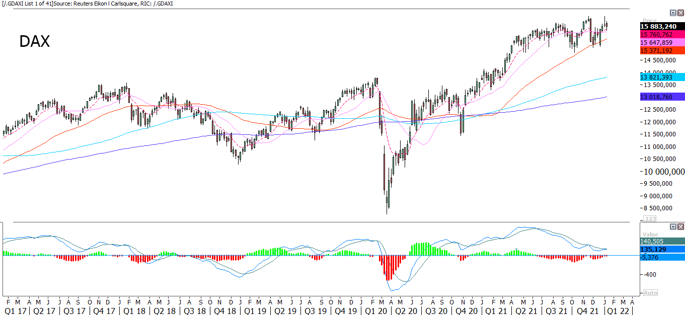 German DAX closed Friday below EMA9, but MA20 is still intact.