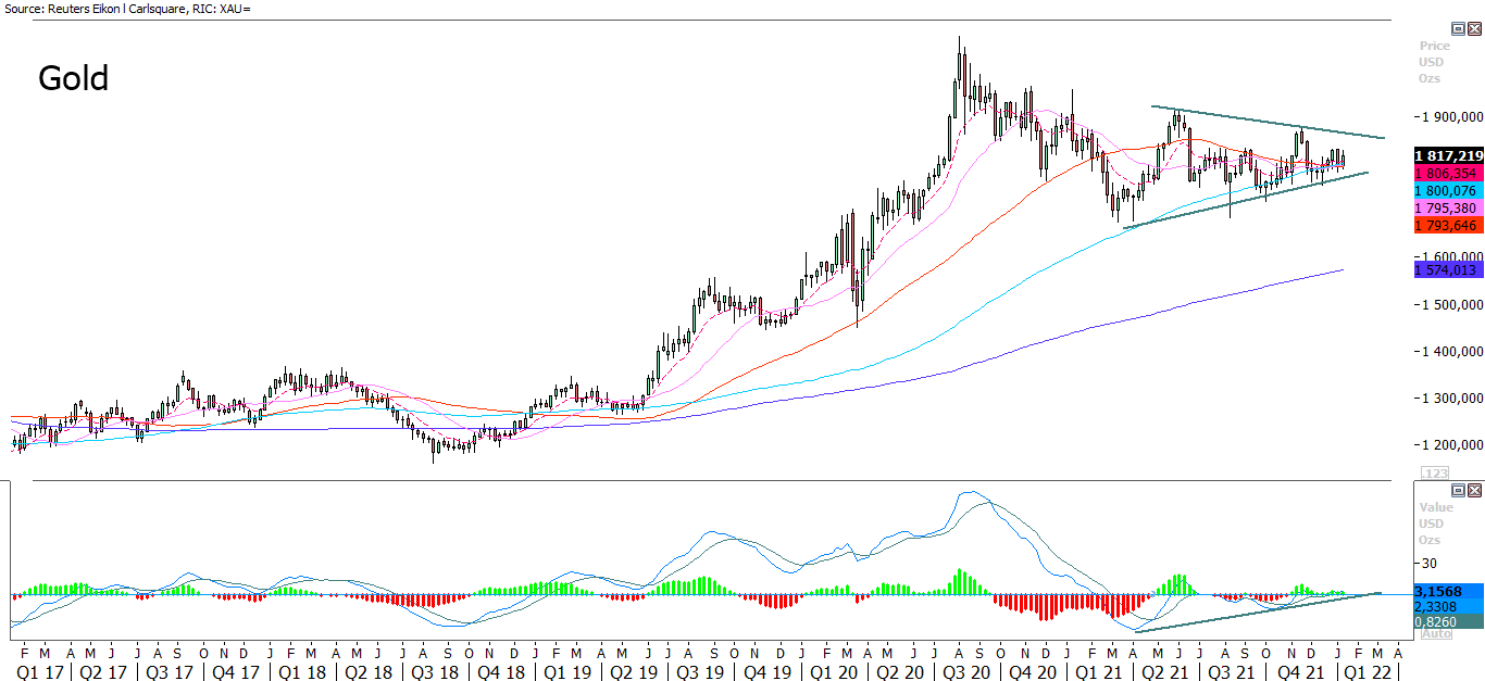In the weekly chart, gold is trading in a neutral wedge formation. Note how momentum is rising visualized by MACD.