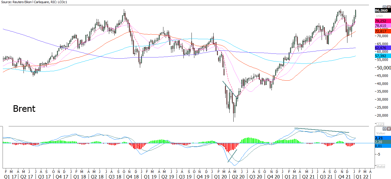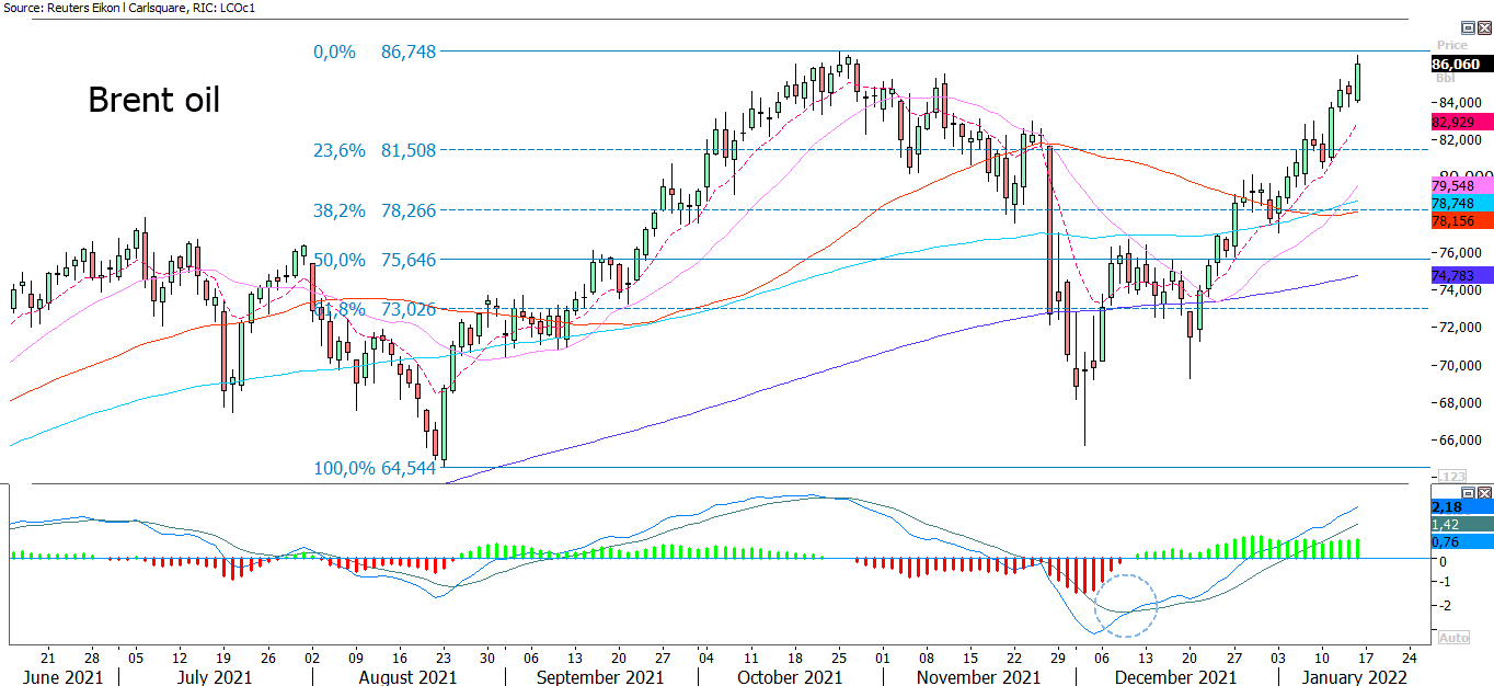 A weaker USD typically supports gold as well as the oil price. The brent oil has also been going strong for various reasons lately. The chart below shows that the oil price is approaching the previous local top from October 2021. Momentum is strong but can it last to break up?