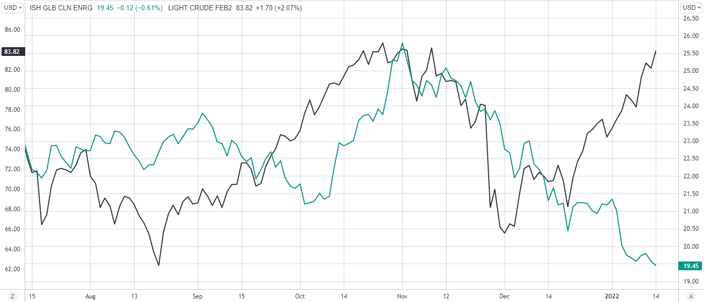 While the oil price is on the move, the opposite is true for the IShares Clean Energy ETF. See the chart below.