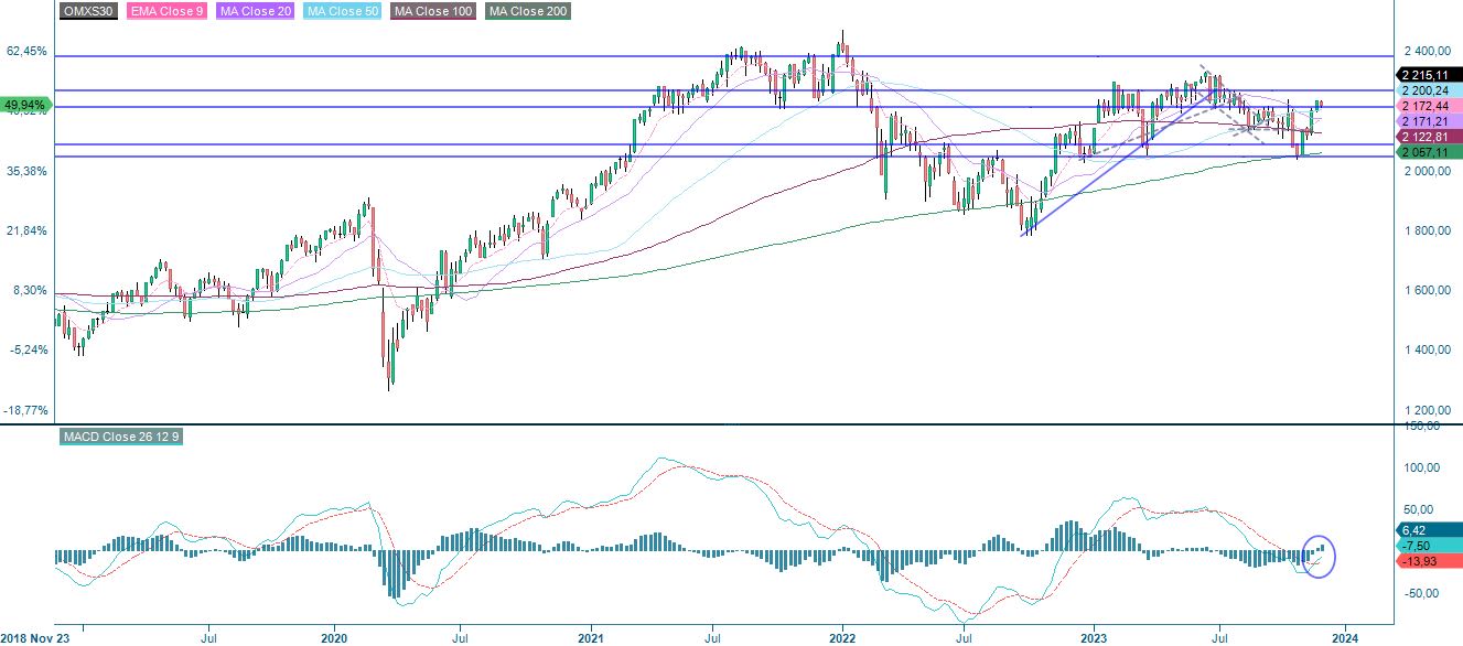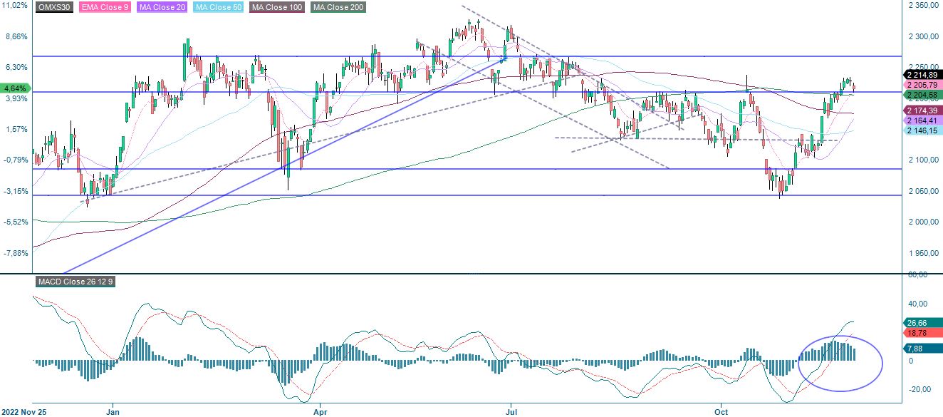 OMXS30 has broken up above MA200 but is currently losing steam. As for the US equity indices, a trigger is needed for the strong rally to continue.