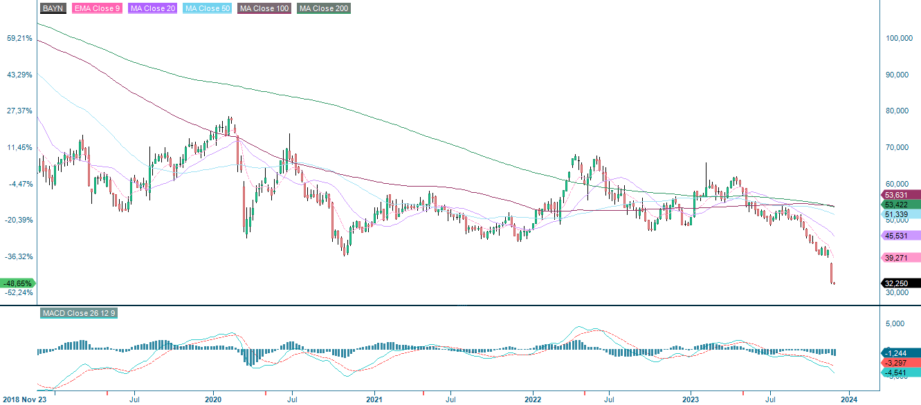 Six days after the removal, it was announced that Bayer terminated their phase III-study Ocean-Stroke, investigating the efficacy of asundexians in patients with atrial fibrillation at risk of stroke. The recommendation came from an independent data-oversight committee, which noted that efficacy was below the control arm. On the same day, Bayer lost a legal battle in Missouri, USA. The main ingredient of Roundups, glyphosate, has long been in the crosshairs of farmers claiming it causes cancers. After nine straight legal wins, Bayer have, as of recently, started losing, with the latest being the fourth in a row. The loss means Bayer will need to pay USD 1.56 billion in damages. The pile-up of bad news has caused the share to slide, dropping to over 30% in three months. Further woes came from Moody’s, with the credit rating prospects changed from stable to negative, reiterating their Baa2 rating.