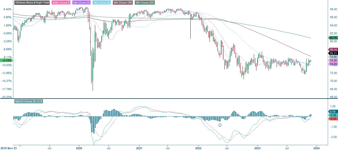 Investors' risk appetite has increased somewhat as of lately, but not by much. The HYG ETF (graph below), which mirrors US junk bonds, has recovered somewhat but is still at historic lows.