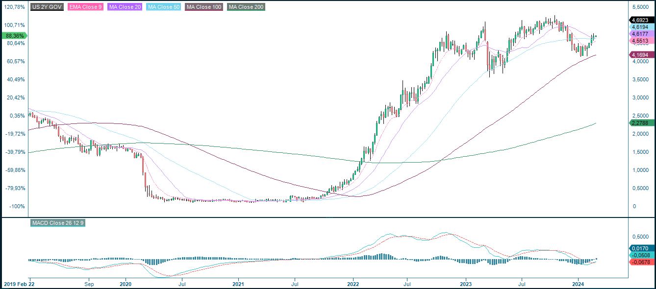 US 2-year Treasury Yield (in %), five-year weekly chart