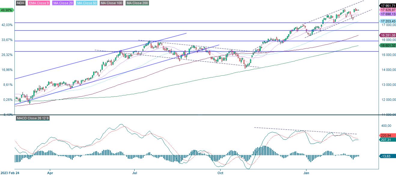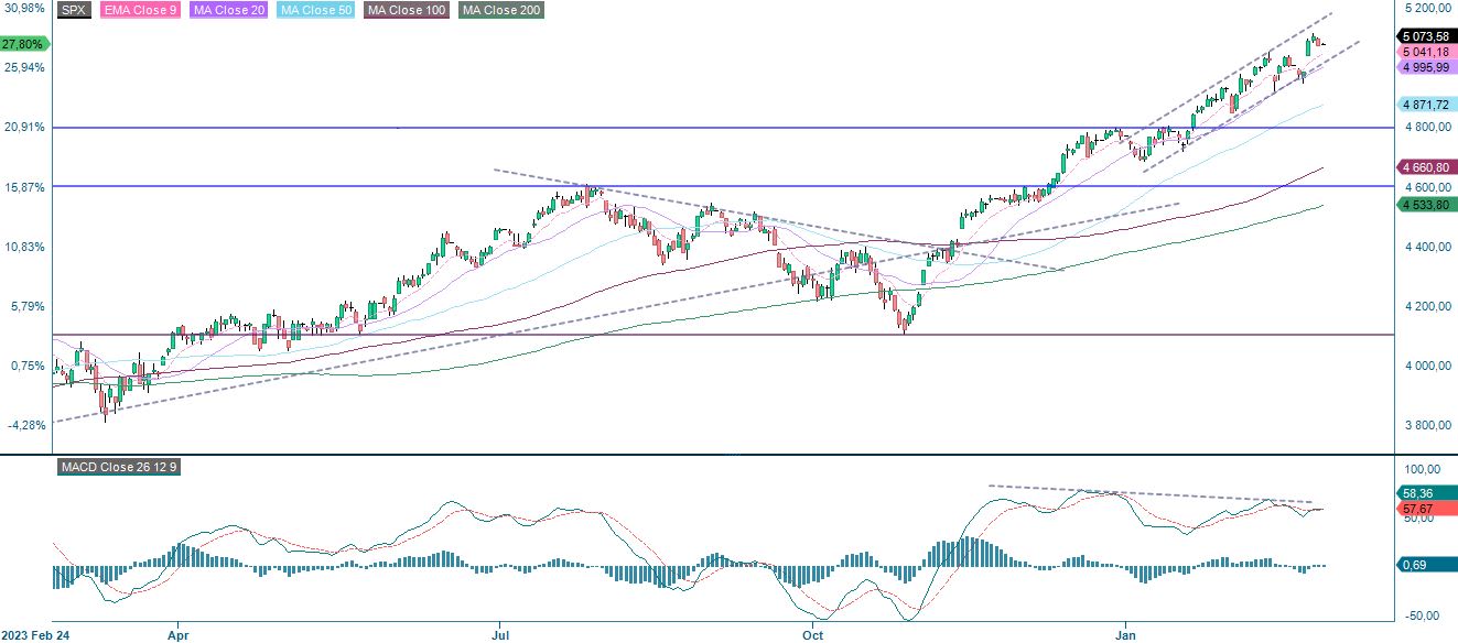 The S&P 500 has broken above the psychologically important 5,000 level. This is despite lowered expectations for interest rate cuts in 2024. So we do not see any clear drivers other than perhaps improved risk appetite and a slight increase in earnings estimates for 2024. From a technical point of view, the negative divergence between the index and the MACD (as well as the RSI) is somewhat worrying. However, a break below the bottom of the narrow rising trend channel and the MA20, which is currently just below 5,000, could trigger a major setback.