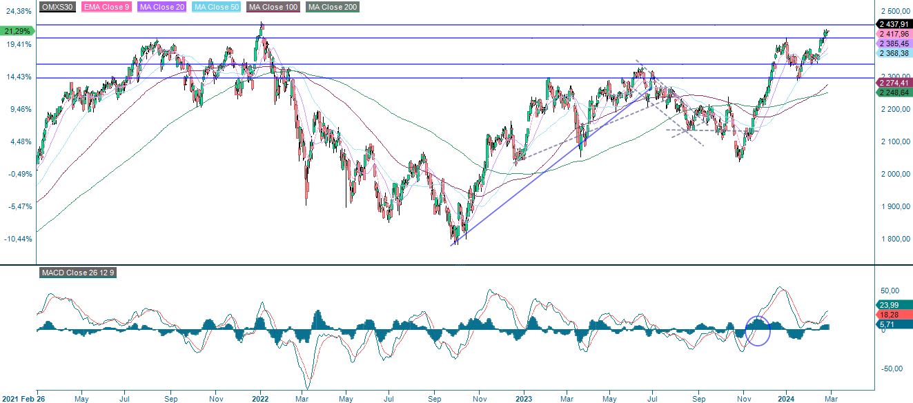 OMXS30 has some catching up to do against its US indices peers. Momentum is rising, and 2,500 may be next.
