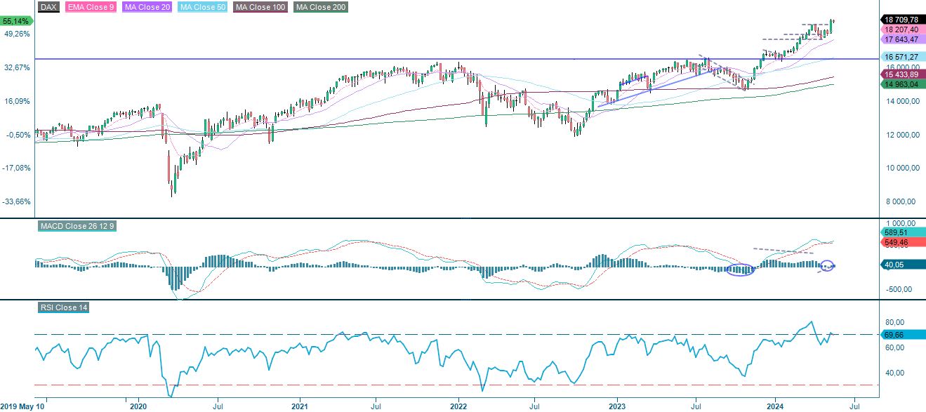 The Nasdaq 100 rather than the S&P 500 looks very convincing from a strict technical perspective on the weekly chart. A target level on the upside has thus been reached, and one could consider reducing the size of potential long positions.