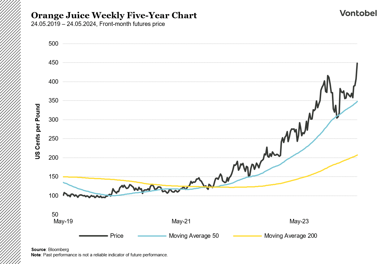 Extreme heat in the autumn of 2023 damaged the orange trees during a period of flowering, which has had a negative impact on the harvest. At the same time, the yellow dragon disease continues to wreak havoc on the orchards, which do not yet have a cure. As a result, prices have continued northwards, with orange juice trading at 469 US cents/pound as of May 23d. The most important trigger to watch for is if a possible cure for citrus greening is found, which would likely bring the price down.