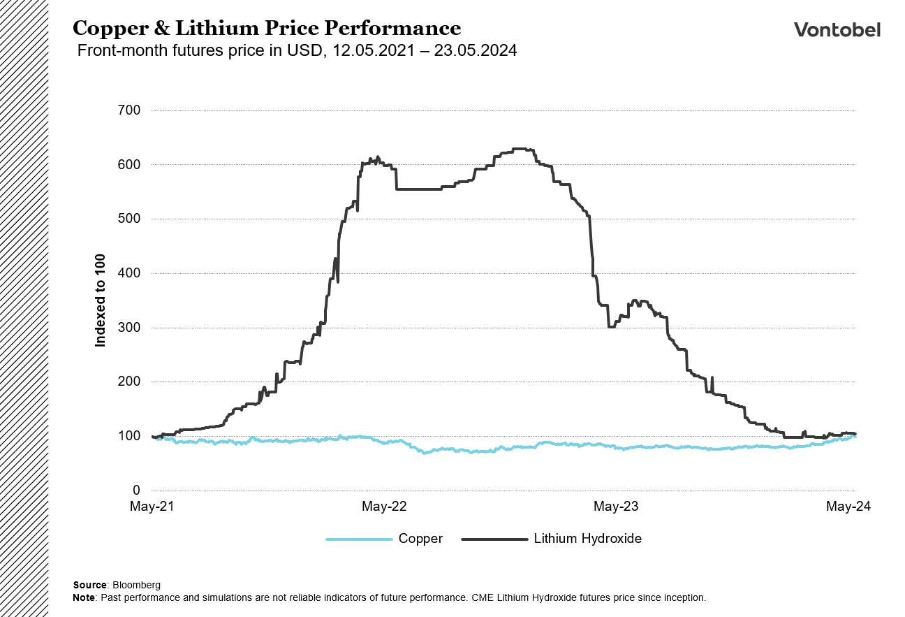 At the same time, investors are questioning whether the sharp rise in copper prices is reasonable. The Yangshan copper premium, which is the premium Chinese traders pay for imported copper above London Metal Exchange reference prices, fell into negative territory for the first time in April. The negative premiums indicate that demand in China, the market's biggest player, is subdued. Sceptics also point to the lithium price. The price of lithium was inflated in 2022 in the hope of increased demand due to the electrification of society (similar reasons driving today's copper price), only to fall flat in 2023.