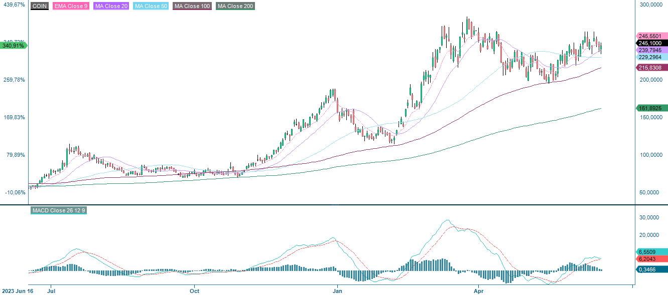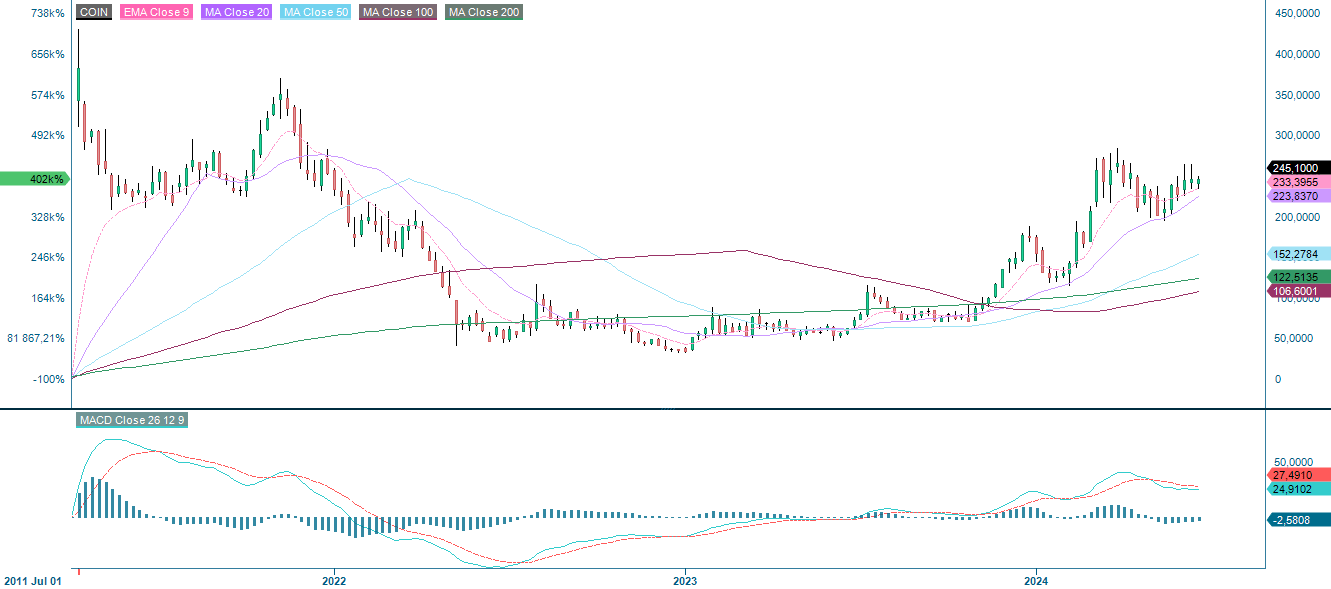 Coinbase (in USD), weekly chart since IPO in April 2021