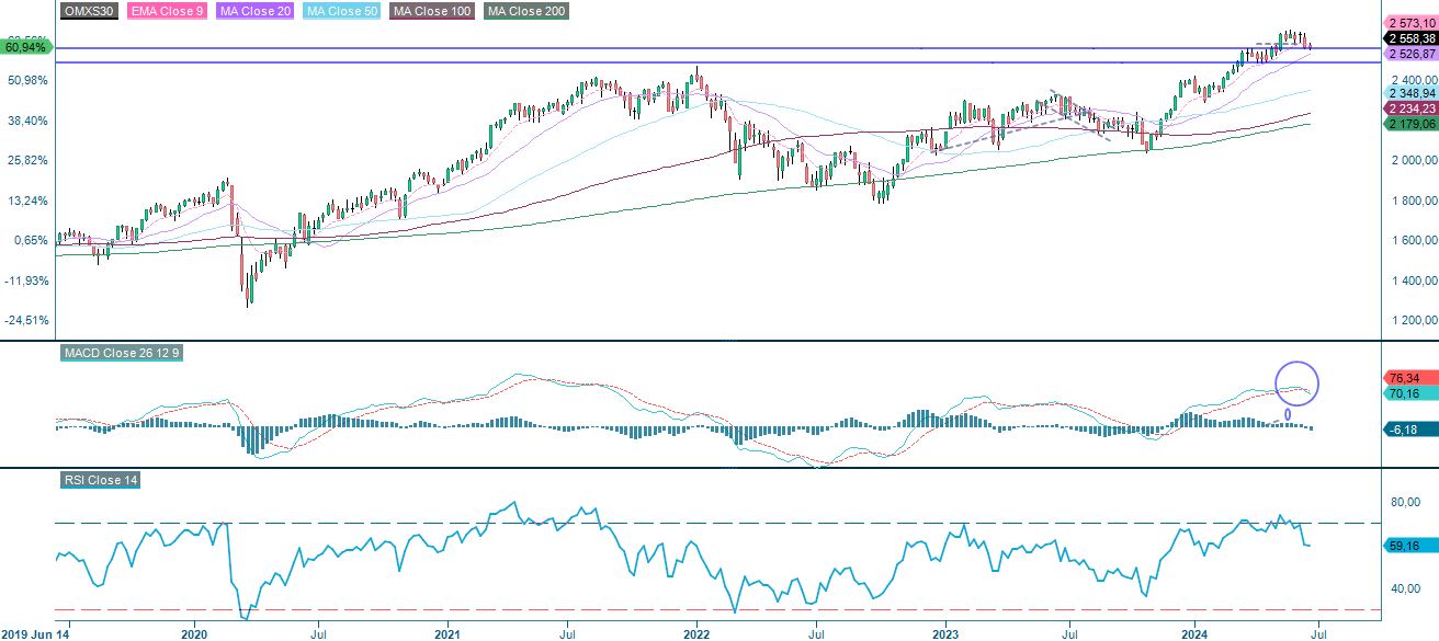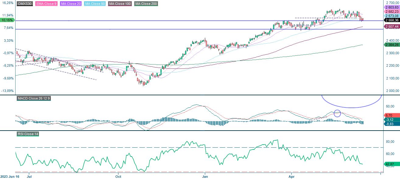 As illustrated in the daily chart below, OMXS30 is facing selling pressure as the index is trading below MA50 close to support around 2,560. Also well worth noticing is that MACD has generated a sell signal.