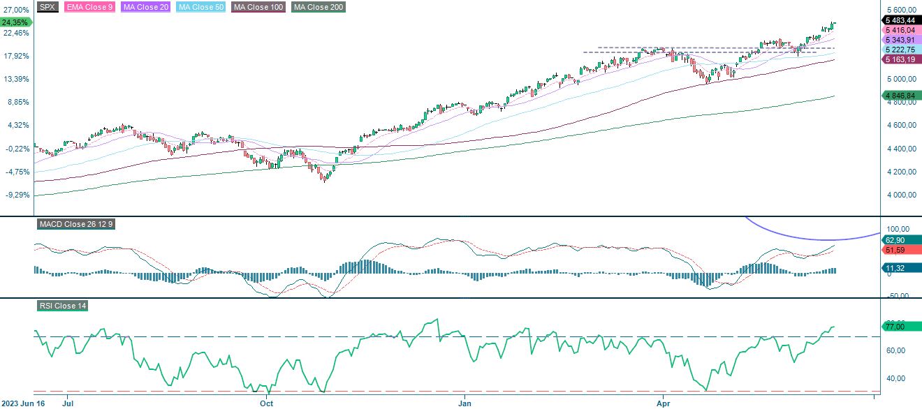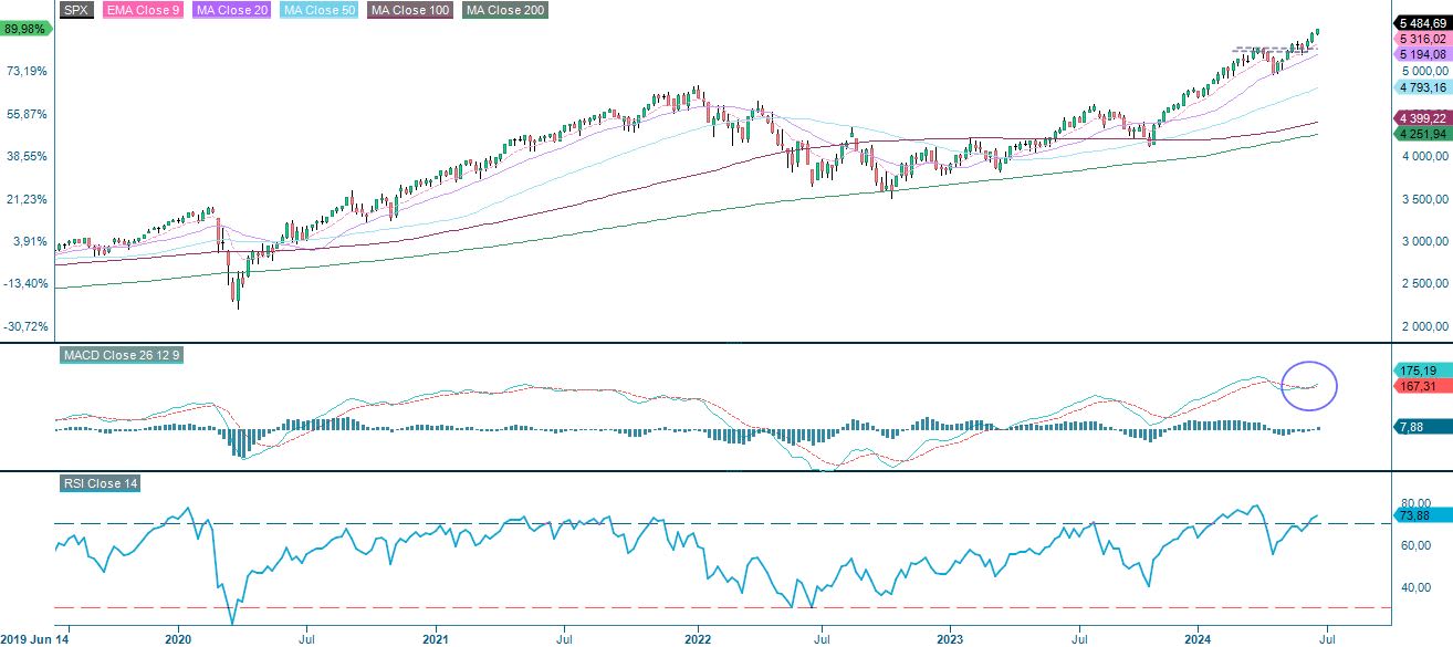 The S&P 500 continues to rally, driven by falling interest rates. Momentum is positive and rising. Meanwhile, the RSI on both the daily and weekly charts are overbought. However, this is not a clear sell signal. Nevertheless, it might be wise to be cautious around these levels.