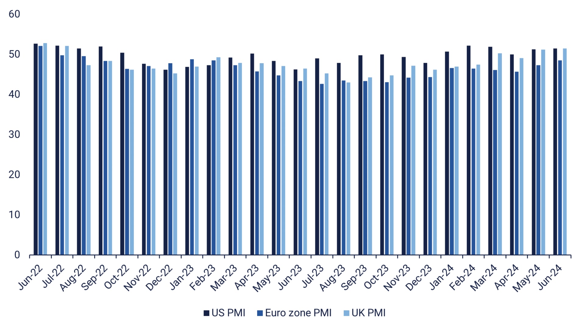 Manufacturing PMI for the US, the euro area and the UK June 2022-June 2024 (forecast)