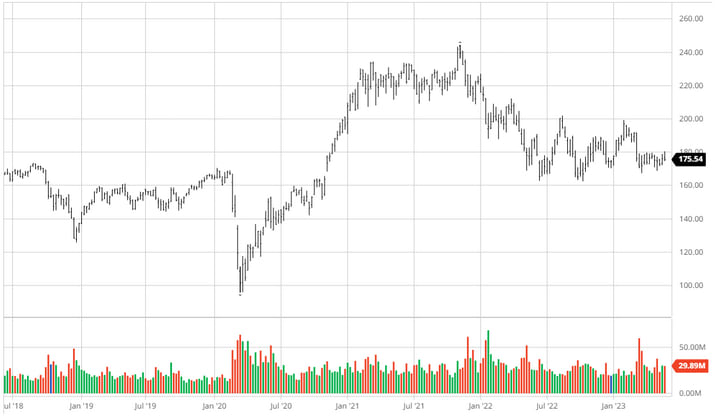 IShares Russell 2000 ETF (in USD), five-year weekly chart