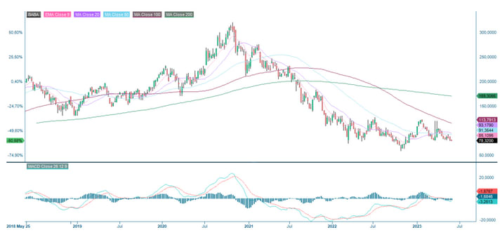 Alibaba published its financial statement for Q1 2023 on Friday, 18th May. At first glance, the company’s performance was less than satisfactory. The growth rate of year-to-year revenue was only 2%. The income from operations decreased by 9% year-over-year. But the net result improved from a loss of RMB 18,357 million to a net profit of RMB 21,996 million (USD 3,203 million) primarily due to net gains from equity investments in publicly traded companies. However, there is a political risk in Alibaba. Rumours of an impending break up of Alibaba have been swirling since the founder of Alibaba, Jack Ma, who has been bold enough to question the Communist Party’s decision and suggested specific regulatory changes being needed. The authorities in China do not like the idea of a sizeable non-state-owned enterprise outshining the party. China has taken a series of actions against big tech as tightening rules on data security or clamping down on alleged monopolistic behaviour. Some people believed that the forced disaggregation of Alibaba was only a matter of time. Combining those concerns with the ungratified financial result, Alibaba stocks falling the next day after the report’s release should not cause much surprise.