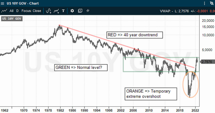 - Long-term interest rates have come up a lot since the bottom in 2020. The end of quantitative easing and the gradual reversal of the central banks' balance sheets will contribute to further upward pressure on long-term interest rates in the future. At the same time, any recession will give a negative impulse, and the level e.g. the US 10-year government yield has now reached is perhaps in a zone we can call a "normal level" (see the image below). In that case, perhaps most of the immediate negative effect of interest rate increases is now behind us, but the interest rate cannot be expected to be a positive impulse going forward.