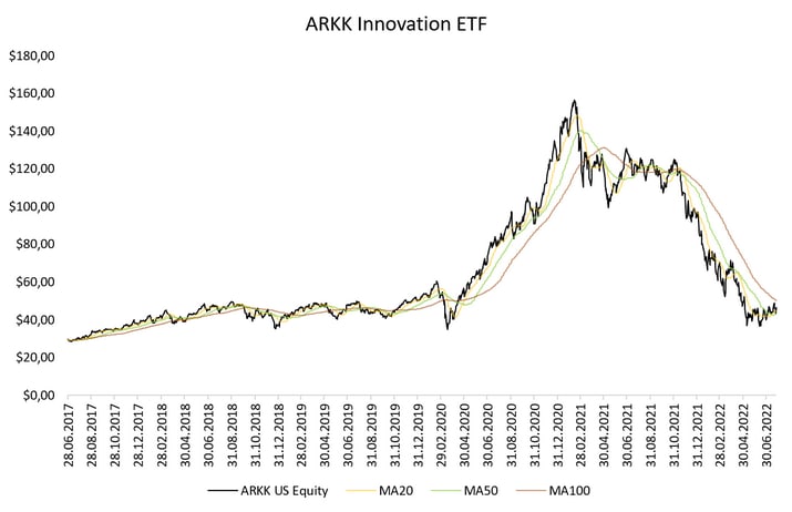 ARKK Innovation ETF in USD, daily. Source Bloomberg. Past performance is no reliable indicator of future results.